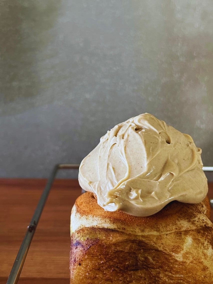 国産小麦を使った生地に北海道産クリームチーズと沖縄県産キビ糖を使用したチーズクリームたっぷりの天然酵母シナモンロールです。